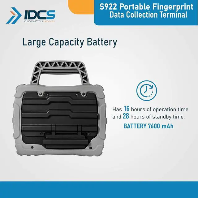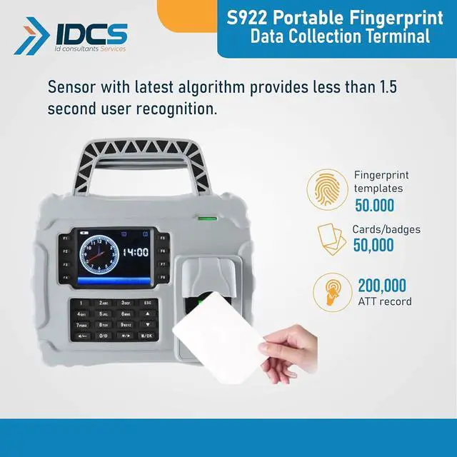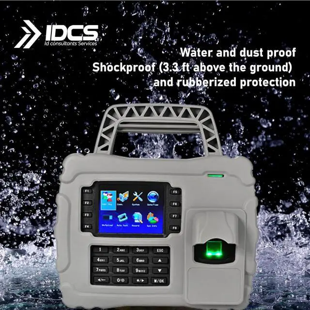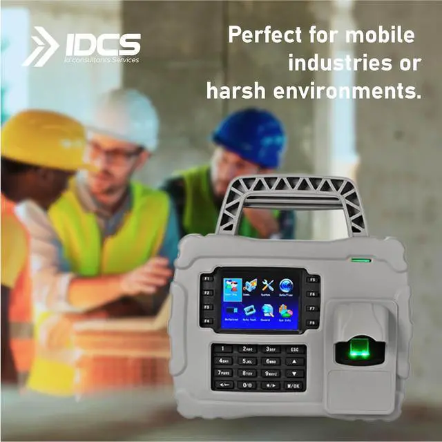 Rugged & Portable Design Built with a rubber protective cover and flexible handle, designed for construction sites, logistics, and any tough environment. Advanced Biometric Recognition High-speed fingerprint sensor with <1.5s recognition time and visual/audio confirmation for accepted or rejected entries. Large Capacity Stores up to 5,000 fingerprint templates , 30,000 cards, and 200,000 transaction logs. Connectivity Supports TCP/IP, USB-Host. Long-Lasting Battery Equipped with a 7,600 mAh rechargeable battery providing up to 16 hours of continuous operation or 28 hours on standby.