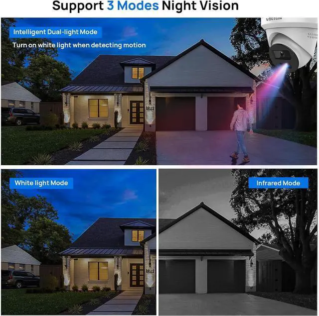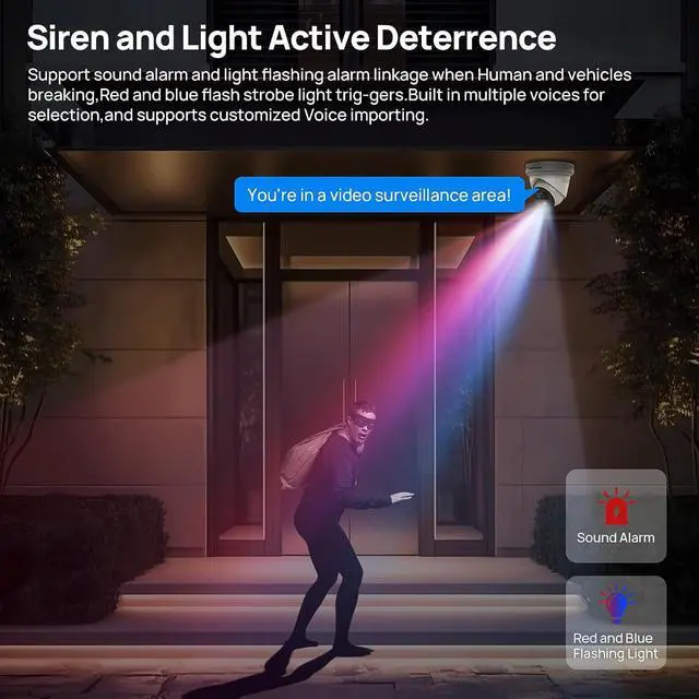 Excellent Video Images5-megapixel(3072x1728) resolution featuring enhanced low light capability utilizing the latest CMOS image sensor and chipset. Red and blue strobe light alarms and audible warning active deterrent for intruders. Double deterrence function is off by default, you can set the working time period, you can choose one of the alarm function work.
