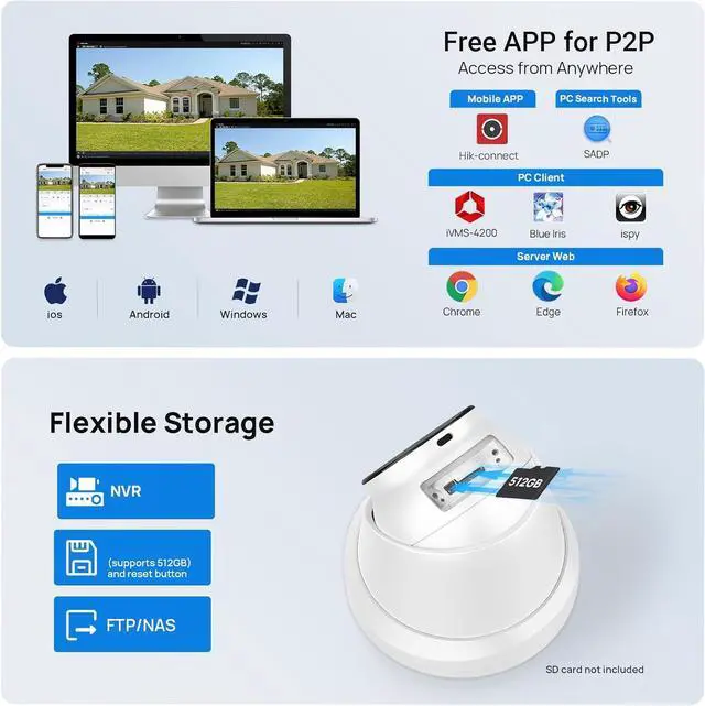 AI Human Vehicle DetectionTurret 5MP PoE camera features human-vehicle detection and receives real-time image notifications via push and email when motion is detected. You can customize the motion detection zone and alarm sensitivity to further reduce unwanted alerts. Supports quick playback of timeline events. NVR, MicroSD, NAS, FTP Video Storage, SD card slot supports up to 512G (not included)