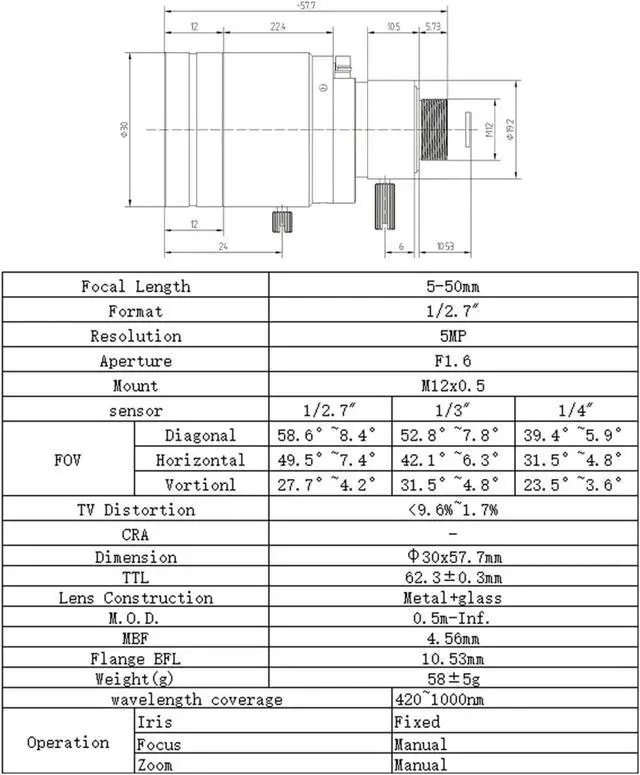 M12 Mount Lens:Easily attach this M12 mount lens to a wide range of cameras for quick and secure installation.