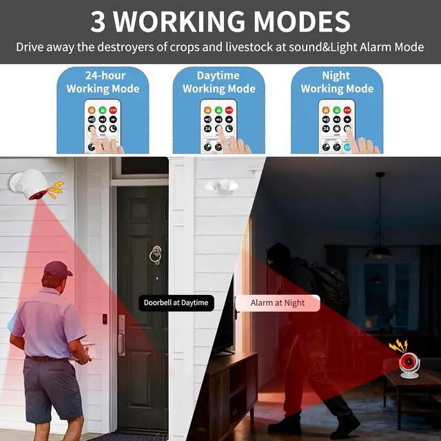 Your Essential Security Solution Featuring dual security modes, this versatile indoor/outdoor motion alarm delivers powerful protection and smart functionality. Its Loud Alarm mode activates a 125dB siren to effectively deter intruders and wildlife, while the gentle Chime mode provides polite visitor notifications and helps monitor children or pets near restricted areas. With three programmable operation modes (24-Hour/Day/Night), the system automatically adapts to your schedulefunctioning as a doorbell during daytime hours and switching to security protection at night for intelligent, round-the-clock safety management.