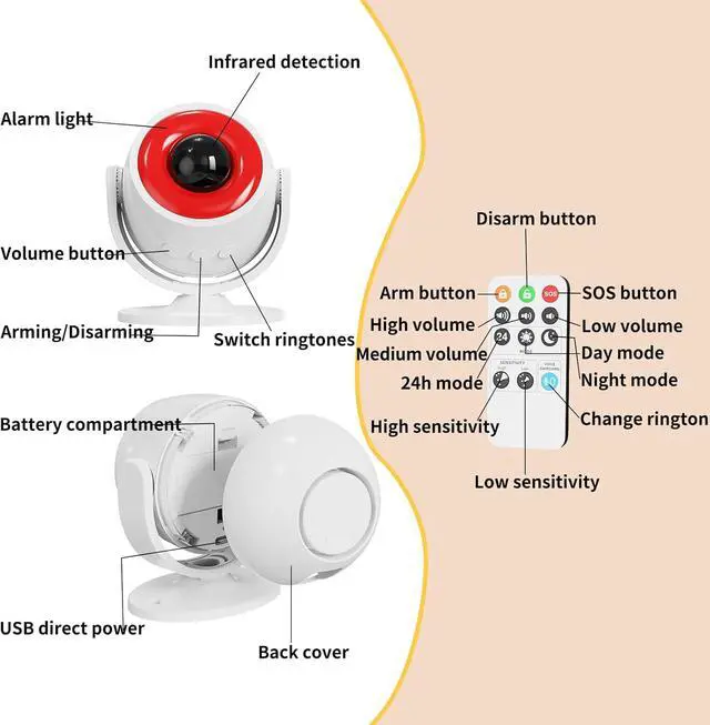 Dual-Control Home Security Device This wireless motion sensor offers versatile control through both a 16 ft infrared remote and innovative physical buttons on the device. You can quickly arm/disarm the alarm system or switch modes without searching for the remote. A dedicated SOS button instantly triggers the highest-level alert during emergencies. With three volume levels and dual control options, managing your security is effortlesswhether from the couch or up close.