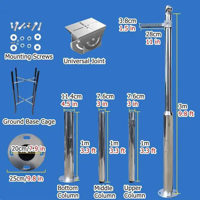 Easy Assemble: The segmented combined surveillance camera pole is assembled from 2-3 sections of poles, which is easy to transport and install, and is equipped with mounting screws and ground cages
