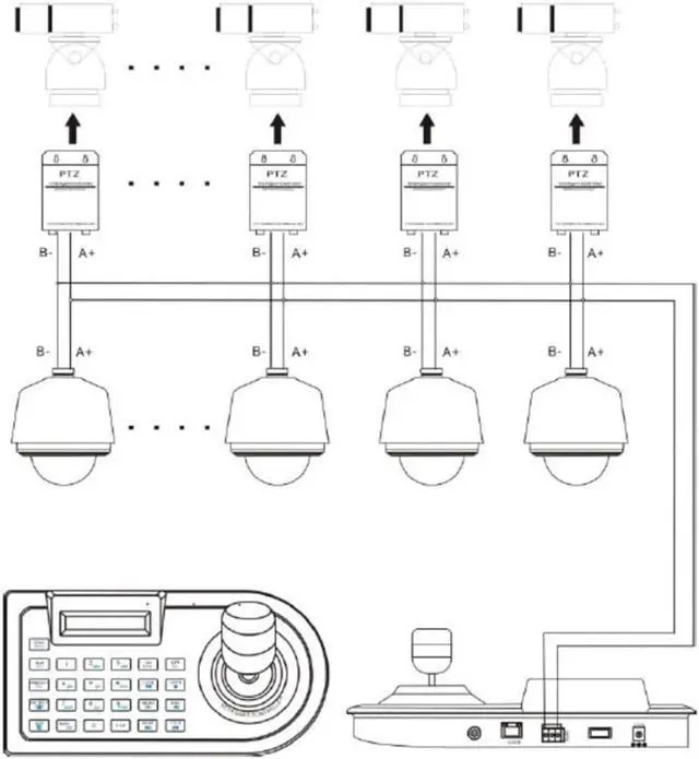 The EIA/-485 communication interface is used between the control keyboard and the receiver. After the control keyboard is connected to the hard disk video recorder, the function control of the corresponding hard disk video recorder is realized, and up to 16 units of hard disk video recorders can be controlled at the same time.