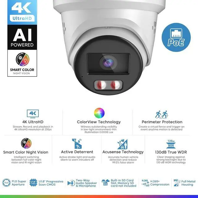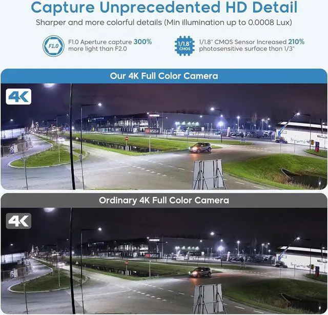 Ultimate 4K with unprecedented detailStunning ultra-high quality 4K resolution utilizing the F1.0 super aperture, 1/1.8 CMOS high-performance sensor, friendly LED lighting, this 8MP PoE IP camera excels in capturing rich and vibrant full color video, ensuring exceptional clarity and enhanced details. It achieves an astonishing minimum illumination of 0.0008 Lux, allowing you to seize even the finest details in the darkest environments.108.8° wide angle allows you to cover more area.
