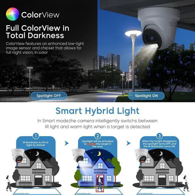 Smart Hybrid Light ModeYou can benefit from overall safety and full agility. When no targets are present, the camera exclusively utilizes infrared light that is invisible to the human eye, achieving environmental friendliness and energy efficiency. Once an intruder is detected, the camera's lights will automatically turn on to warn potential perpetrators. The max distance up to 98ft. You can also switch to infrared night vision and full color night vision modes to meet your different needs.