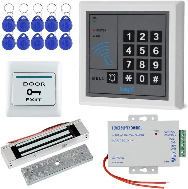 Package includes: 1 RFID access control keypad + 1 DC12V 3A power supply + 1 180KG electric lock + 1 exit switch button + 10 RFID blue key chains