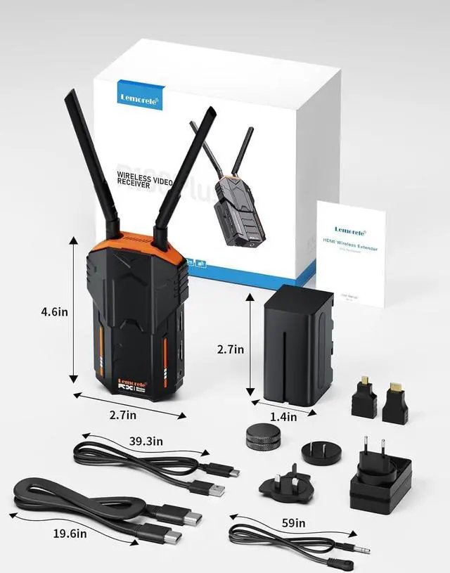 Permanent After-sales Service and Product ListLemorele always offers one year product warranty, you can request unconditional return and exchange, and maintain a 24-hour online human customer service to welcome your inquiries at any time. Product list: 1*Receiver, 2*Antennae, 1*4400mAh batteries, 1*HDMI cable, 1*USB C cable, 1*IR cable, 1*Power adapter, 1*mirco-hdmi adapter, 1*mini-hdmi adapter, Manual.
