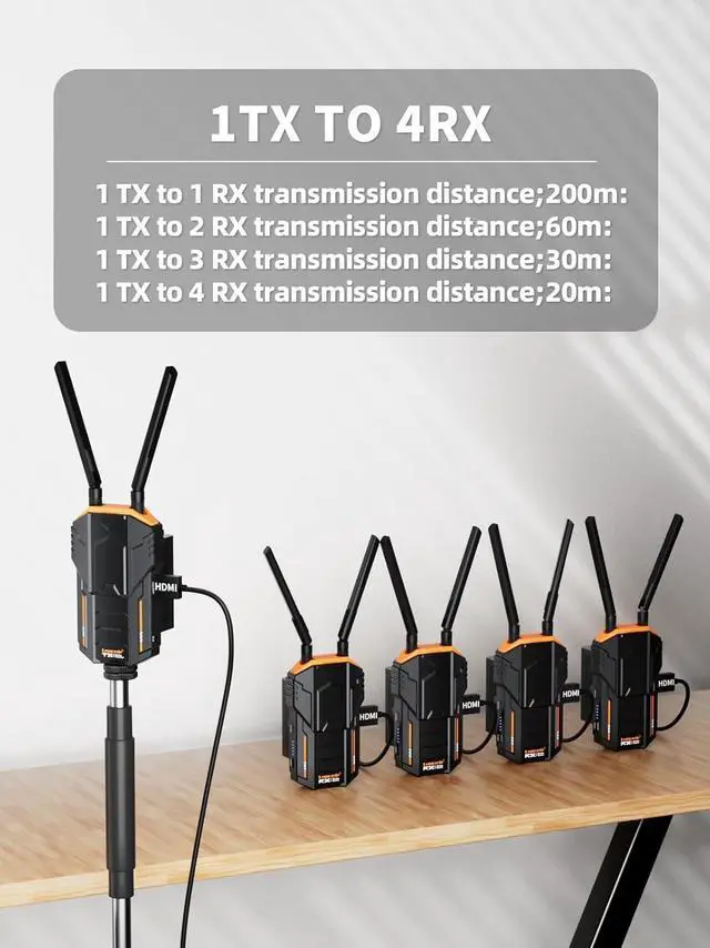 1 Transmitter can be paired with 4 ReceiverTo meet the requirement of large enterprise for big conference, one wireless HDMI transmitter (TX) can be paired with 4 receivers (RX) by one switching, please pair the new HDMI transmitter with receiver at the first using time.