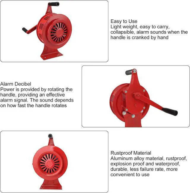 STURDY AND DURABLE: This hand crank sound alarm is made of aluminum alloy structure with rustproof paint on the outside, which is more sturdy and wearable, waterproof, durable and has long service life.