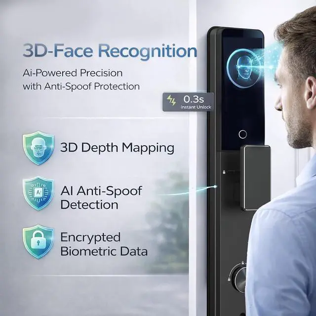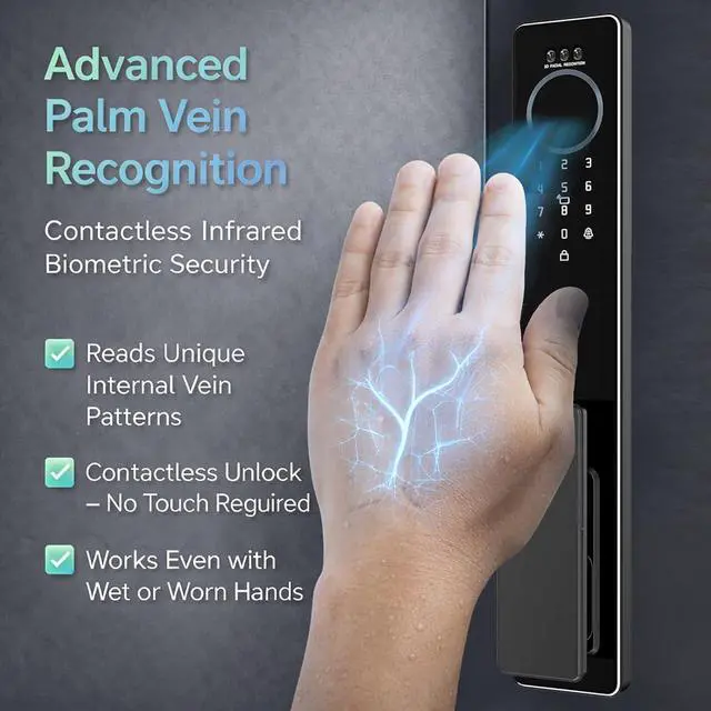 3D Face Recognition & Palm Vein Biometrics: Using cutting-edge infrared technology, the lock provides fast, contactless entry even in low light. The added Palm Vein scanner offers a secondary layer of high-security biometric verification that is nearly impossible to forge.