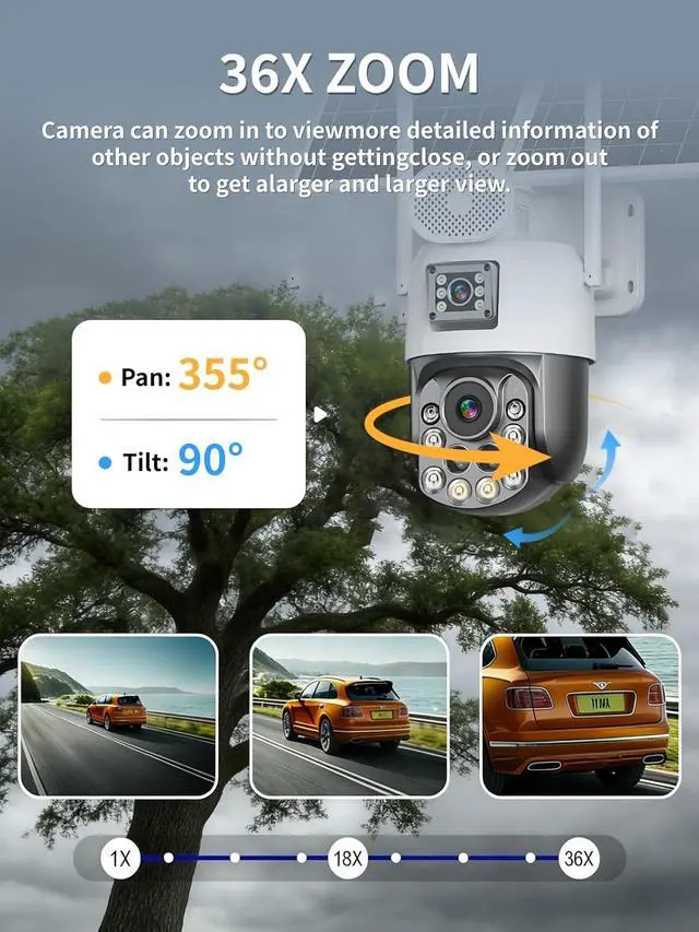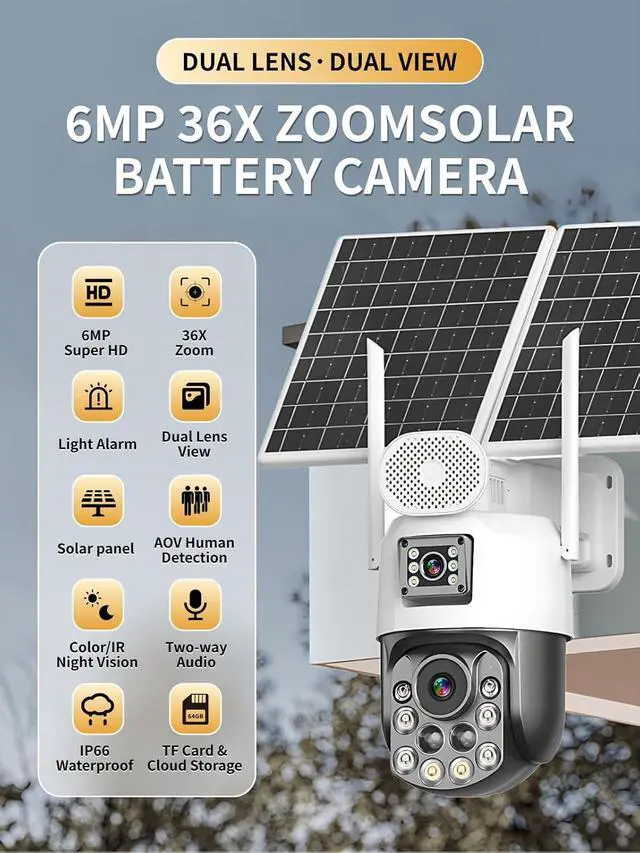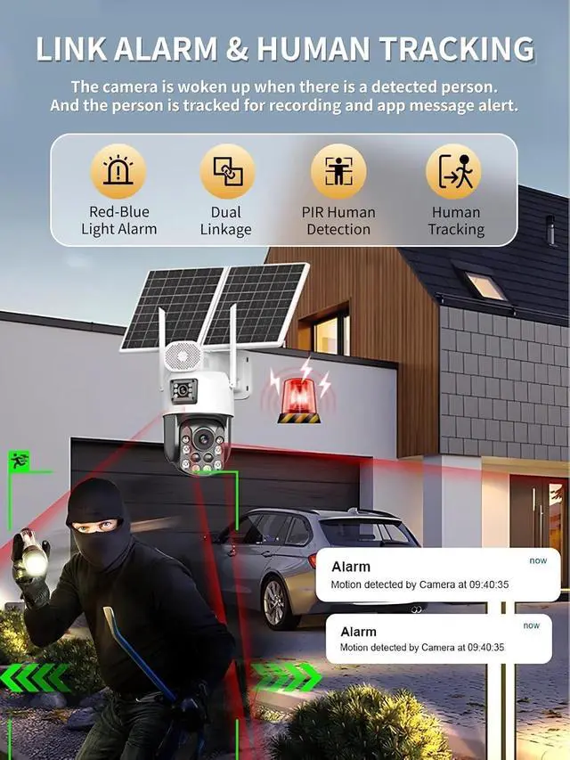 Full Color Night Vision & 6MP HD lmage:The Solar Security Camera features two night vision modes: infrared, and full-color.With 6MP resolution, it delivers crystal-clear, detailed images, ensuring video quality and enhanced security in any lighting condition.
