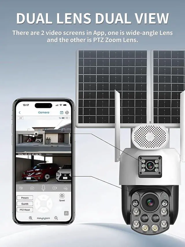 Dual Lens=One Camera, Two Perspectives:The Dual Lens Security Camera integrates two lenses into a single device, delivering dual functionality in one convenient package. Monitor two areas at the same time directly from your phone. One lens captures a wide panoramic view, while the other offers 355° pan and 90° tilt for comprehensive coverage without blind spots.