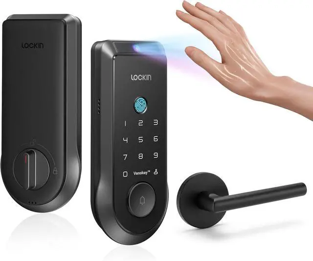 • 6-in-1 Keyless Entry Palm, Fingerprint, PIN, App, Voice & KeyNever fumble for keys again! Enter with palm vein, fingerprint, passcode, app control, voice control, or backup key. Create temporary access codes for family, friends, cleaners, dog walkers, or Airbnb guests. Manage access remotely ideal for homes, apartments & rental properties.