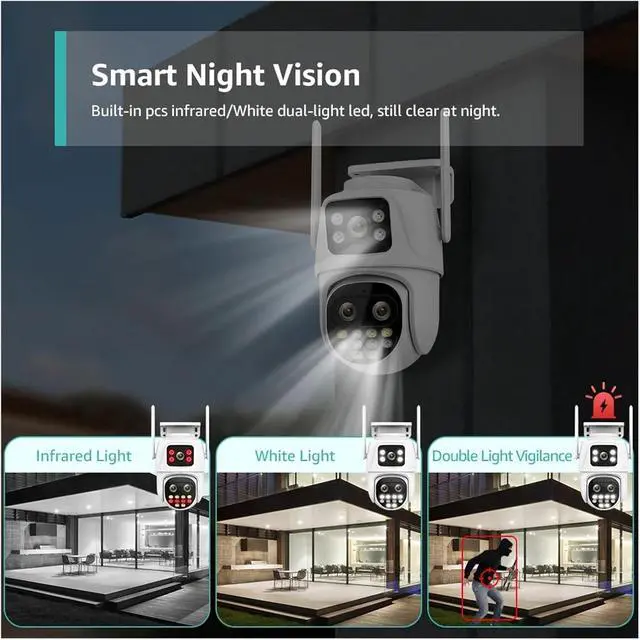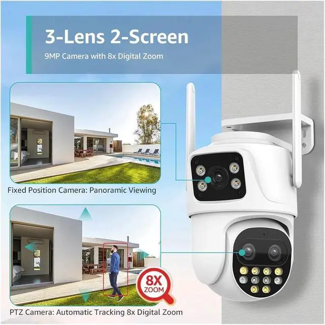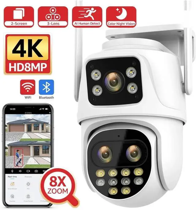 Multiple specifications available + dual/triple lens design, making monitoring more flexible: Available configurations include 4MP (dual 2MP) / 8MP (dual 4MP) / 9MP (triple 3MP), a fixed panoramic lens + PTZ rotating lens combination, dual/triple screen synchronized monitoring, one device covering multiple devices, suitable for different security needs.