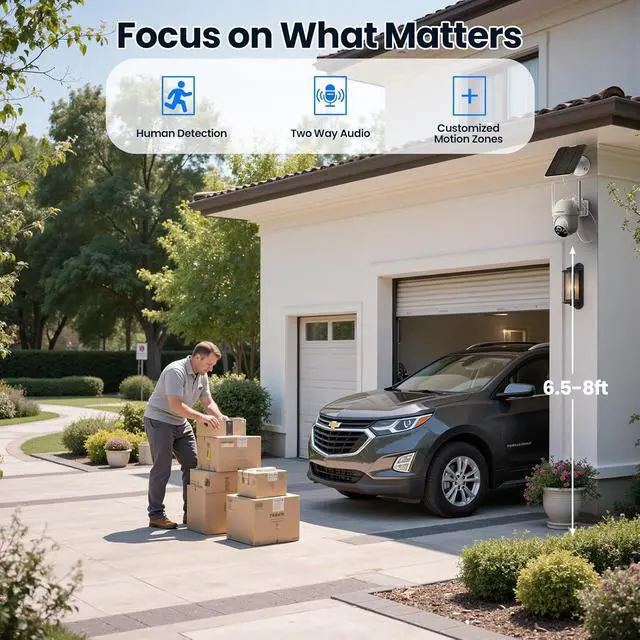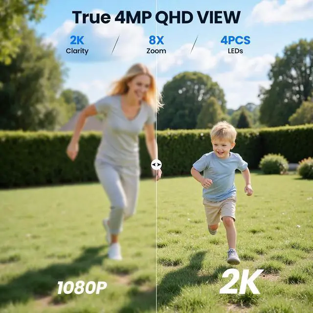 4MP Ultra High-Definition for Day and Night: The solar camera outdoor wireless delivers evidence-grade clarity with 2560×1440p ultra-HD video. Enjoy vibrant color night vision in low light conditions.Clearly indentify faces and plates, day or night