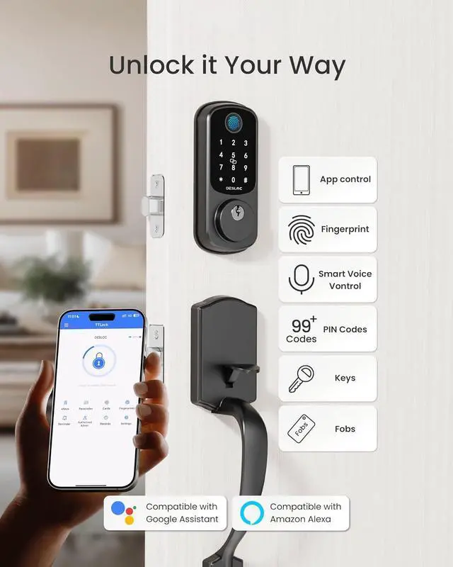 D110 Plus:Powered by FlashPrint Algorithm technology, fast unlock the door less than 0.5s with fingerprint. You can also enjoy keyless entry with passcodes, voices or app. Or unlock with mechanical keys and fobs. Compatible with Google Assistant and Alexa for convenient hands-free access anytime