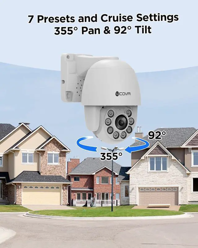 ULTRA CLARITY & WIDE VIEWING ANGLE: This 6MP PoE outdoor PTZ camera delivers ultra-clear footage and sharp IR night vision up to 328ft. Its 2.713.5mm motorized lens (5× optical zoom) provides detailed images and wide-angle coverage. The camera supports 355° pan and 92° tilt, easily adjustable via the PTZ menu for full-area monitoring