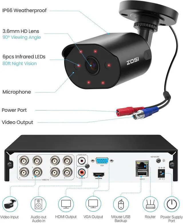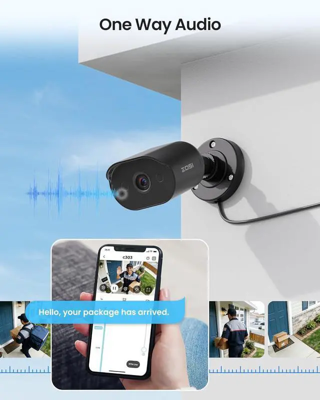 (4). [ Audio Recording & Easy Local / Remote Playback ]__ Integrated microphones allow audio recording alongside video for enhanced situational awareness. View live footage or play back recordings by date, time, or event locally via a monitor or remotely through the ZOSI Smart App, PC, or tablet anytime, anywhere.