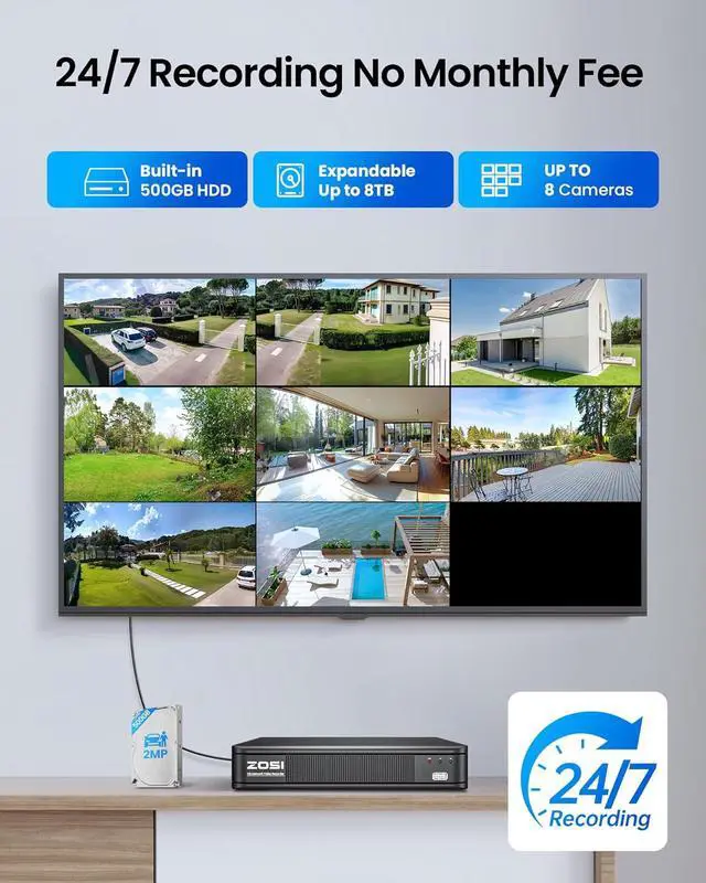 (5). [ Advanced H.265+ Compression & Flexible Recording Modes ]__ Powered by H.265+ video compression, this system optimizes storage efficiency while maintaining clear image quality, saving up to 80% storage space compared to H.264. Choose from multiple recording modesincluding 24/7 continuous, scheduled, motion-only, and recycle recordingand back up footage easily via USB when needed. Note: This system supports wired analog cameras only and is not compatible with IP/PoE or wireless cameras.