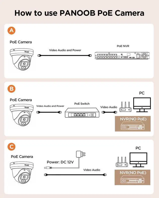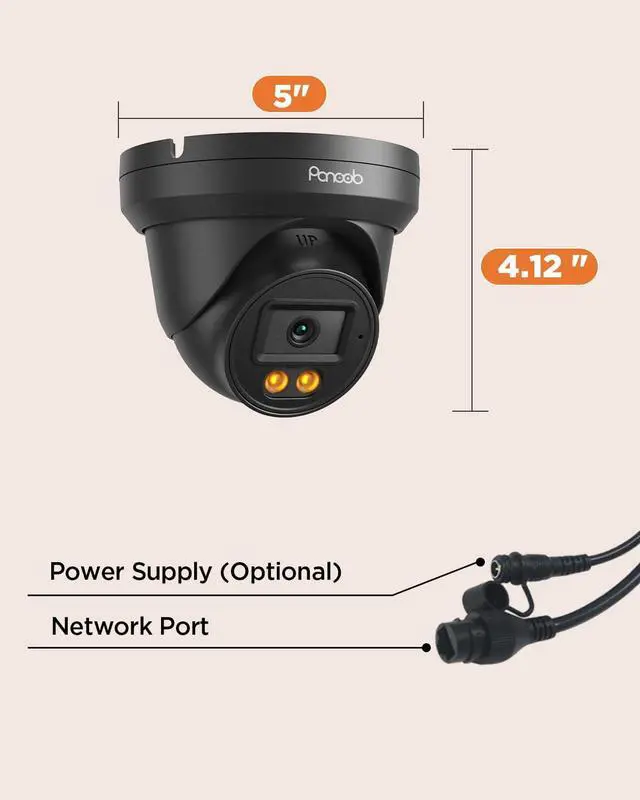 Work with Panoob PoE NVR: For optimal integration, this camera pairs with Panoob PoE NVRs to enable an intelligent system featuring AI human detection and mobile alerts for remote viewing. Compatibility with third-party NVRs is contingent upon shared support for DHCP, the 802.3af PoE standard, and corresponding network protocols.