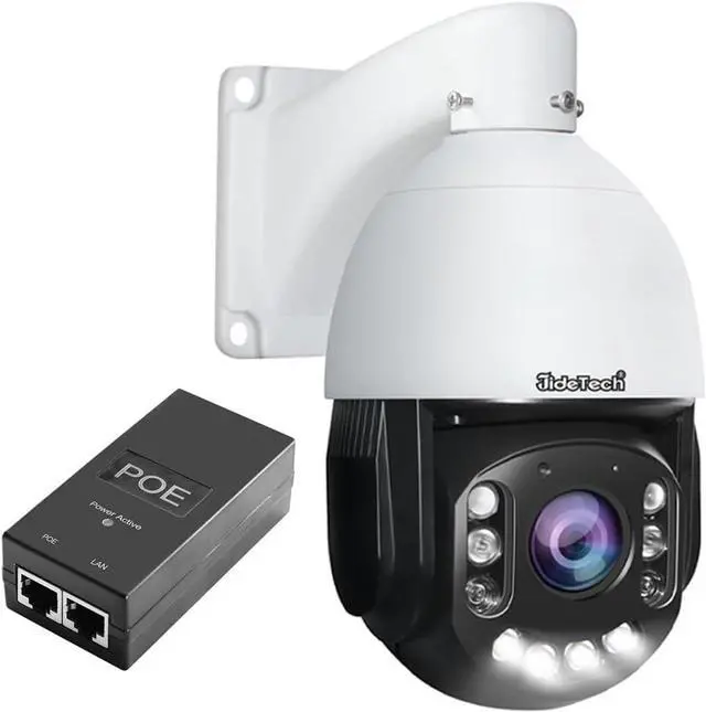 Jidetech 4K Outdoor PTZ Camera supports dual-axis rotation with 360° horizontal and 90° vertical movement, achieving a Max rotation speed of 90°/sec. Equipped with 6 infrared lights and 4 white LEDs, it delivers night vision up to 492 ft with starlight-level performance and enhanced color reproduction. Offers three night vision modes: Full IR, White Light, and Smart. Upon detecting suspicious activity, the device triggers an audio alarm and automatically activates white light illumination, combi