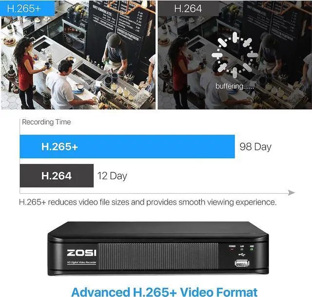 (4). [ Advanced H.265+ High Efficiency Video Compression ] __ ZOSI self-developed H.265+ video coding technology extract features that focus on characteristics of the surveillance scenes for larger storage space and better image quality. H.265+ can further improve compression ratio on the basis of H.265 standard and save about 80% storage compared with H.264, and thus effectively saving storage resources and provides an excellent and smooth viewing experience.
