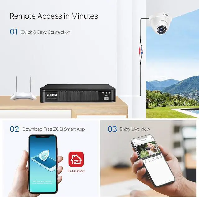 (3). [ Local or Remote Access, Playback Anytime & Anywhere ] __ View and control your security system locally by connecting the system to a monitor without internet, or via free ZOSI Client software on tablet, PC, or via Smartphone APP (ZOSI Smart ) on mobile devices remotely.You can also playback significant evidence or funny videos records by searching different days, hours or minutes.