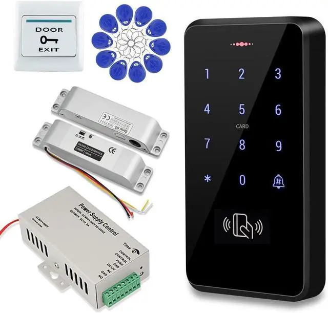 Product includes: 1 x IP68 waterproof access control black, 1 x NC mode electronic bolt lock, 1 x DC12V/3A power supply, 1 x exit release button, 10 x RFID keychains
