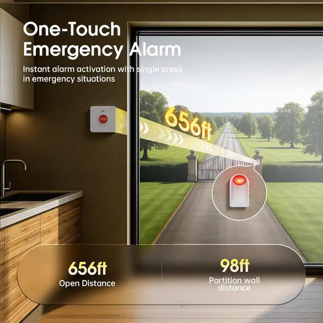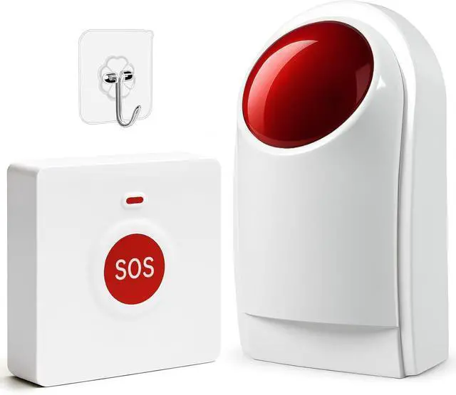 What You Get: Package includes: 1 sound & light emergency siren host, 2 emergency call buttons, 1 user manual, 2 mounting screws, and 1 portable hanging hook. All you need for a reliable ring panic button system.