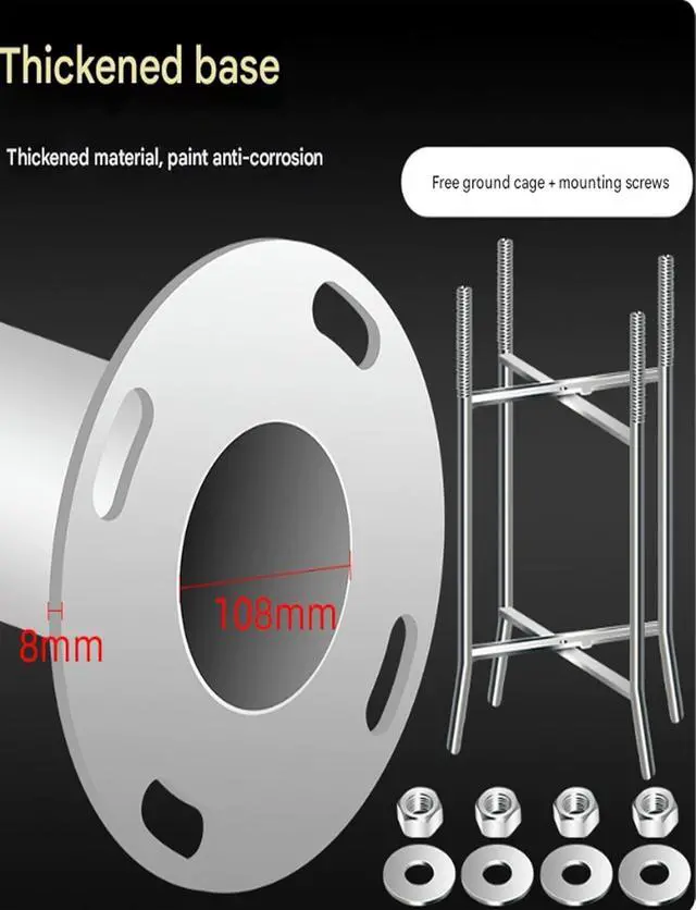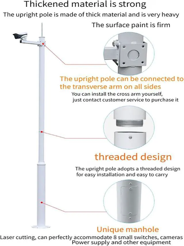 Sturdy Security Camera Pole: This column is made of thick and strong galvanized round steel tubes. The base is supplied with a ground cage and screws, allowing for a firm installation and a stable stand that will not sway even in high winds