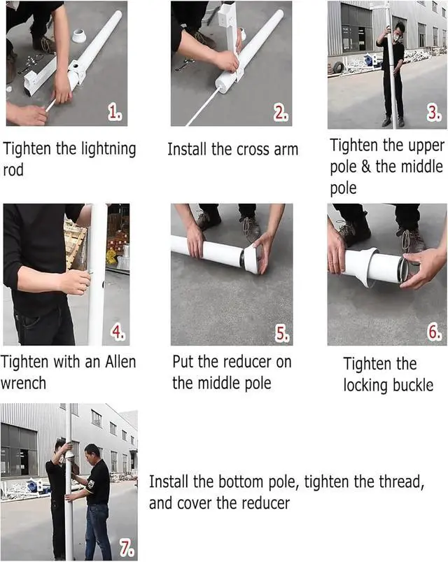 Quick Assembly: 1. Lightning rod and pole screw type interface, just tighten it. 2. Screw tightening cross-arm bracket. 3. Pole Is Segmented. Through decor cap; simply tighten the connections. Suitable for factories, farm, residential, parking lot, parks