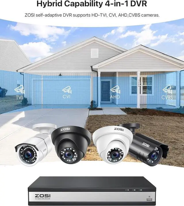 (4). [ Advanced H.265+ High Efficiency Video Compression ] __ ZOSI self-developed H.265+ video coding technology extract features that focus on characteristics of the surveillance scenes for larger storage space and better image quality. H.265+ can further improve compression ratio on the basis of H.265 standard and save about 80% storage compared with H.264, and thus effectively saving storage resources and provides an excellent and smooth viewing experience.