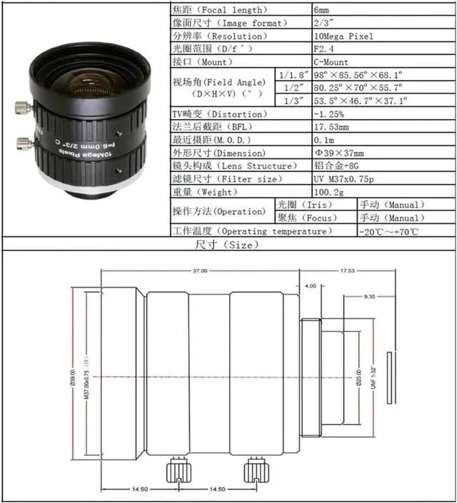 6mm focal length ideal for various industrial applications and close-up photography