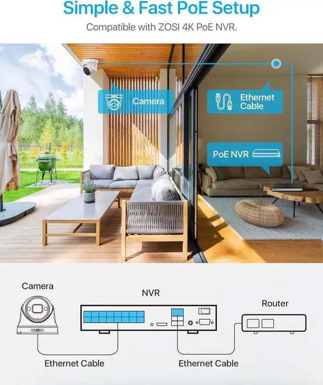Only Work With ZOSI 4K PoE NVRZOSI 8MP PoE add on camera cannot be used separately. It needs to connect the Ethernet cable and ZOSI PoE Surveillance NVR to work. Only compatible with ZOSI 4K PoE NVR(Model: ZR08HN,ZR16HK,ZR08SN,ZR16SK). Each camera comes with a network cable for connection.