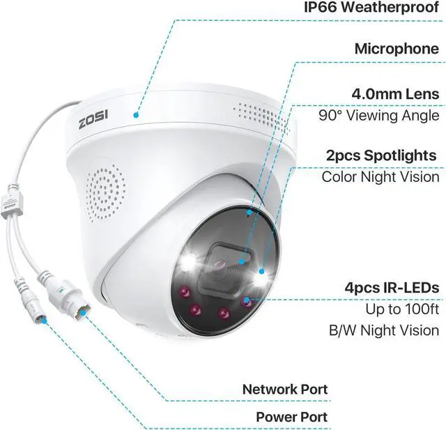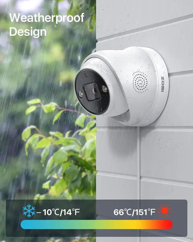 IP66 Weatherproof & Two Way TalkThis outdoor dome camera boasts a durable design that is IP66 weatherproof for years of reliable outdoor use, even in harsh weather conditions. Built-in mic and speaker let you stay in touch with your household. Check in with the family or tell your dog to stop barking, or say hello through the ZOSI Smart App.