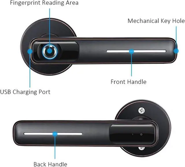 Fingerprints and mechanical keys. Support Key and USB emergency power supply. The lock can recognize 100 fingerprints and the speed is less than 0.5s. Fingerprint handle, easy to install. Semiconductor fingerprint recognition, USB charging port.