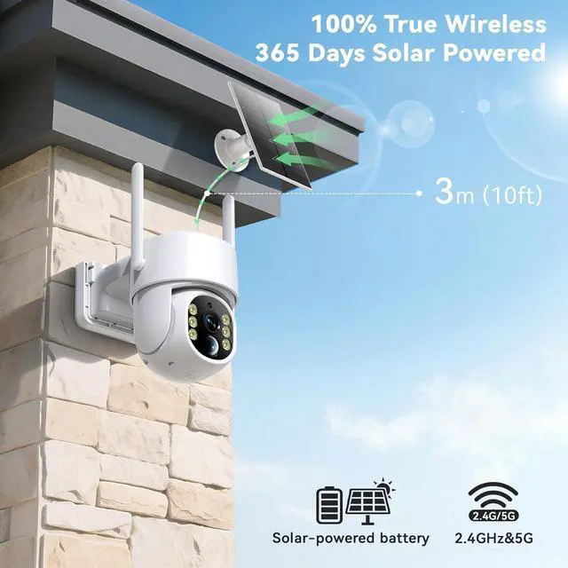 Flexible Storage & Dual-Band Wi-Fi : This solar powered security camera outdoor offers dual storage options: local microSD card (requires separate purchase) and cloud storage. Cloud storage uploads footage to the cloud with no mandatory subscriptionchoose a plan that fits your needs.Dual-band Wi-Fi support delivers versatile connectivity: 2.4GHz provides broader coverage for long-range connections, while 5GHz ensures smooth, high-definition streaming at close range.