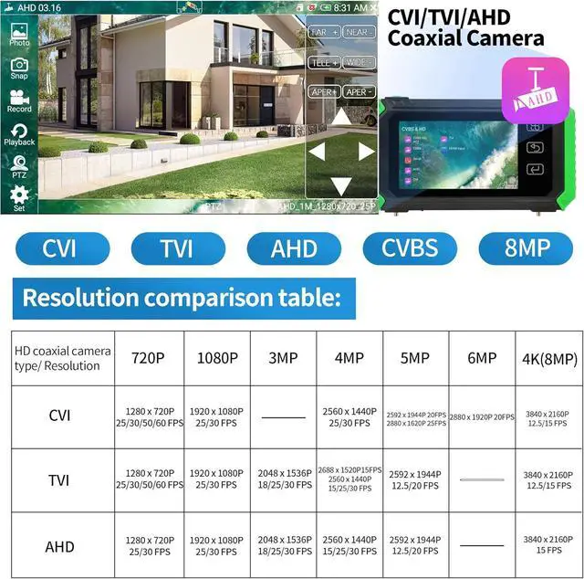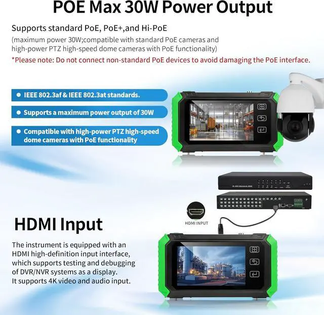 Coaxial Camera Tester: RAINLEOTI 5.5 IPC tester with POE support, can support testing up to 8MP AHD/TVI/CVI/CVBS camerasNOT Support SDI). Support 1 channel BNC input, PAL/NTSC (adaptive).Support UTC PTZ control and call OSD menu, menu settings, screenshots, video recording, video playback, etc. RS485 control, compatible with 29 protocols such as PELCO-D/P.