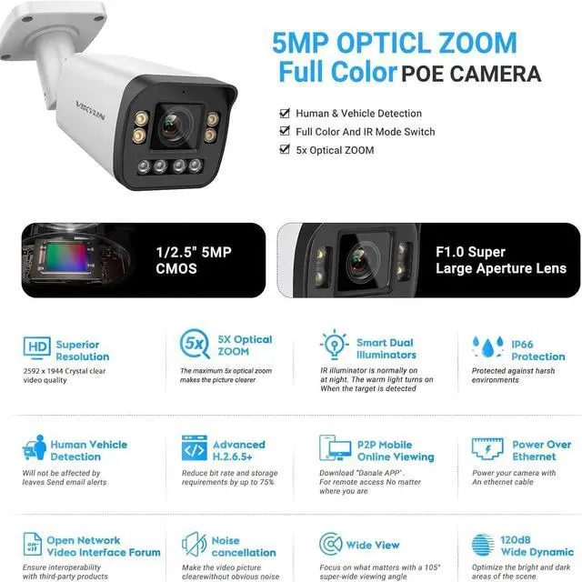 AI FEATURES: 5X Optical Zoom AI IP PoE Camera with human and vehicle detection event filtering; Offers 5MP @30fps video, and supports up to 6MP (3072x2048) resolution.Zoom in for a more detailed image, and Zoom out for a wider view. With Efficiency Video Coding, providing HD video, and reduces the cost of storage and transmission