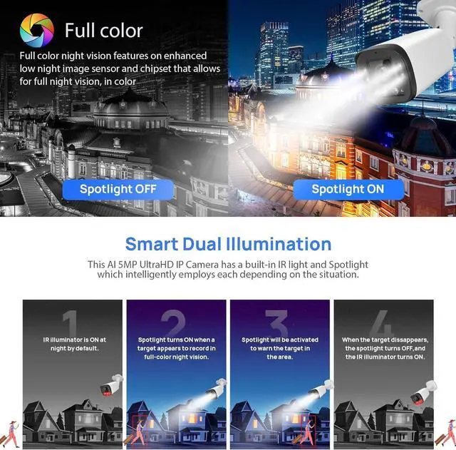 FULL COLOR NIGHT VISION:Enhance low light image sensor and chipset that allows for up to 98ft full night vision, in color;Smart Dual Light technology adopts smart algorithm to detect targets. Usually, the IR illuminator is on at night when the target appears in the monitoring area, the white light is on, and the camera records the full-color video and information of key events. When the target is out of the monitoring area,the IR illuminator is on, which reduces light pollution efficiently