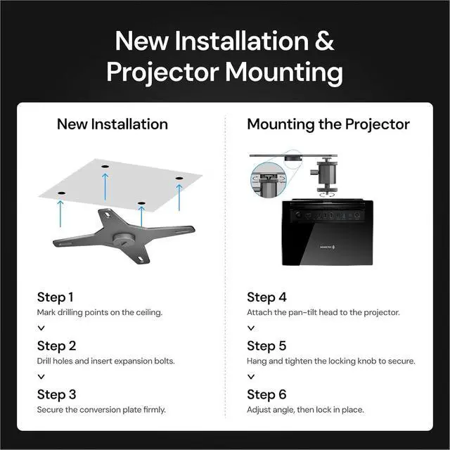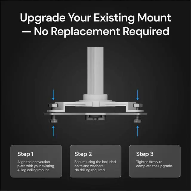 Fast & Straightforward Upgrade ProcessConverts your existing ceiling mount in just a few simple steps using the included bolts and hardware. No complex measurements or ceiling modifications required, making the upgrade process quick and efficient compared to replacing an entire mount system.