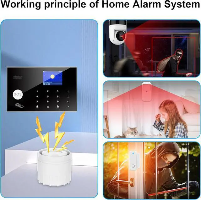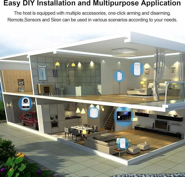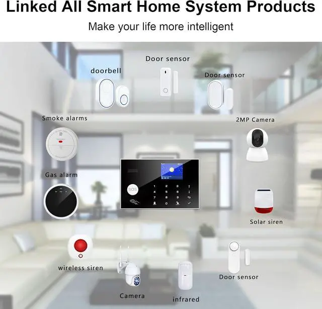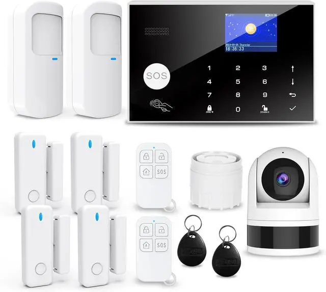 Wireless Home Flight Kit: Includes host, surveillance camera, infrared, SOS, door sensors, buttons, keyboards, buzzers, etc.; 2.4-inch color IPS screen, real-time main interface status bar, data and clock are displayed, and the host status is very clear. It supports multilingual menus, voice commands and SMS alerts.