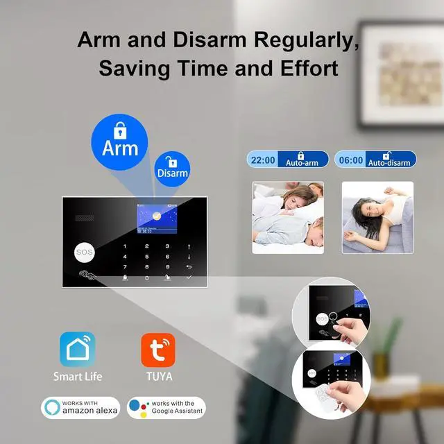 Home alarm: Remote arming and disarming via Tuya Smart app. Remote Controls or Voice Control (Support Alexa, Google Home, or Siri Shortcuts) Set of 13, with 1 Alarm Host, 1 Siren, 4 Window Sensors, 2 PIR Motion Sensors, 2 Remote Controls, 2 RFID Cards, 1 C20 Camera.