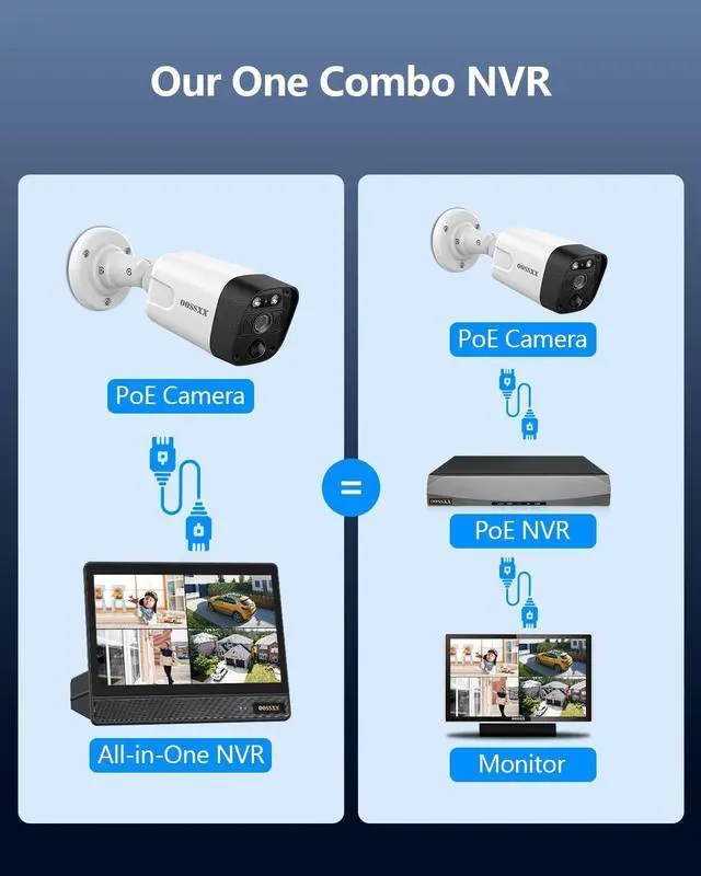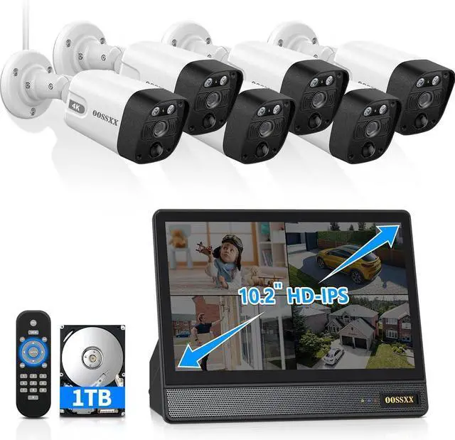 {2-way Audio} You can keep in touch with your family when you miss them and want to talk to them anywhere and anytime. This security camera supports multiple users(up to 4) to view streaming video simultaneously. You can remotely live view or chat by high-quality two-way audio via APP. Just download the free Eseecloud APP from APP Store (IOS) or Playstore (Android) on smart-phone. {130° Ultra Wide-Angle Lens Equipped} Optical wide-angle lens with multi-layer lens, provides you about 130° wide viewing angle and reduces dead ends of surveillance areas. {4K Ultra HD} OOSSXX 4K Ultra HD (8MP, 3840 × 2160) PoE camera delivers almost four times the clarity of 1080p. Our camera kit provides users a vivid display, even when you digitally zoom in. {PIR & Smart AI Two-Way Detected} With the help of advanced recognition algorithms and Infrared Detectors, OOSSXX will send notifications in real time once abnormal actions.Compared with the Motion detection, Two way Detected avoid 99% False Alarm by leaves, cloud, animals or insects. {Plug and Play PoE System} The camera kit comes with 60ft network cables, which allows for easy installation and set-up. After connecting the security cameras to the NVR ports, recording and live views can be seen within seconds via an HDMI monitor. {Free APP No Month Fee} Download the free app "Honestview" from App Store on your smartphone. With an internet connection, you can watch the videos remotely from anywhere on your phone (IOS&Android), PCs, or tablet
