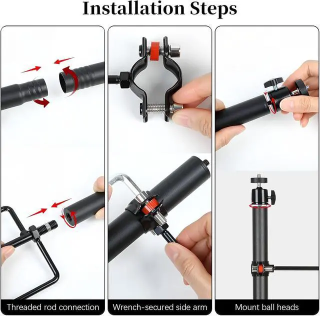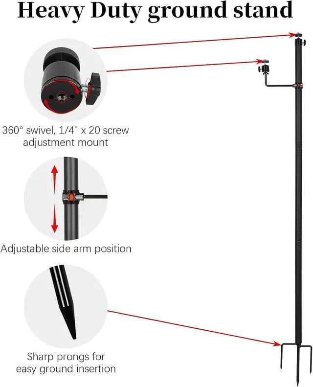 Packing List: The pack Contains poles, arms, ground stake base, ball heads, Allen wrench and screw accessories.
