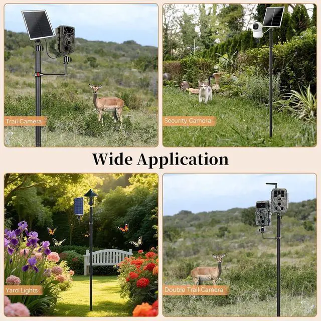Multiple Mounting Options:The 2-in-1 security/trail camera stake mount gives you the flexibility to mount your outdoor surveillance cameras and solar panels together on a bracket, or to mount them separately. It can also mount two cameras at the same time.