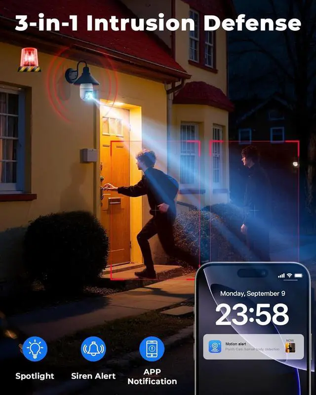 Crystal-Clear 2K Day & Night Vision with 360° Coverage: See every detail, day or night. This 2K light bulb camera outdoor delivers sharp video with 3MP color spotlight night vision plus infrared mode. With 355° horizontal and 90° vertical rotation, one camera covers the entire roomno blind spots, no missed moments.