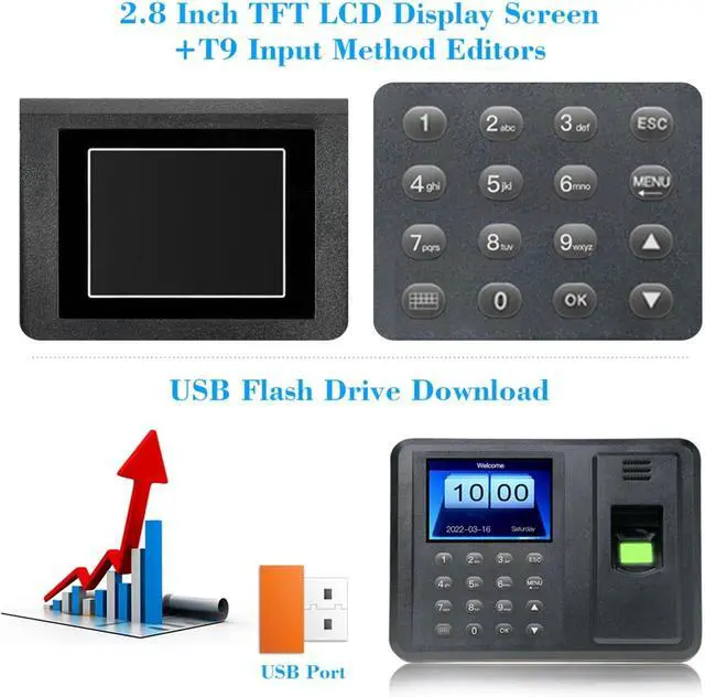 * No software required, T9 input method can edit name, department, shift and other information, and output attendance report directly.