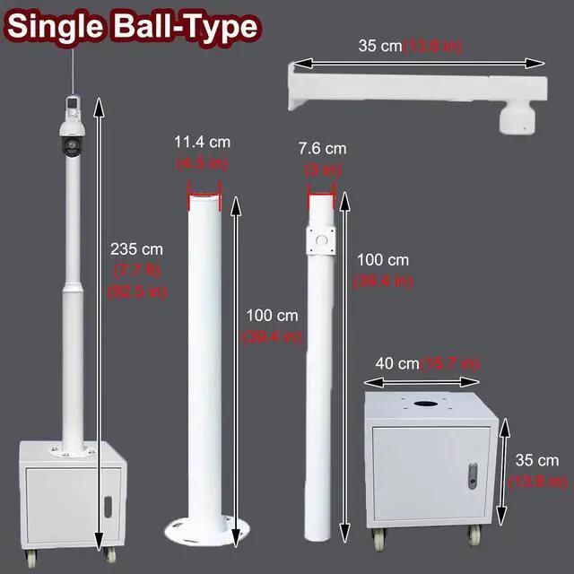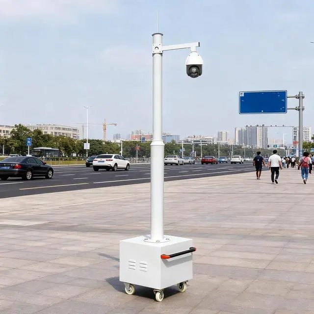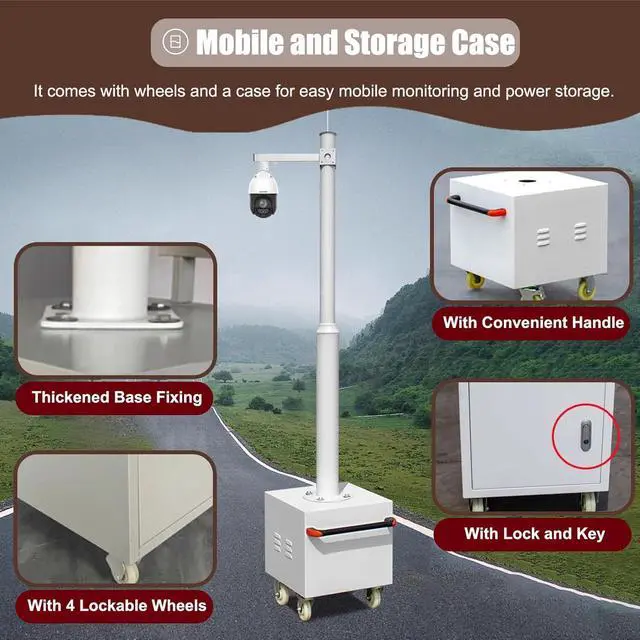 Mobile Monitoring Cabine : Movable pole comes with a 13.8 in high equipment box and 6.6 ft high pole. Equipped with 4 lockable wheels, you can demand flexible adjustment of the surveillance position. Case has a lock and key to stop passers-by opening it